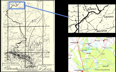 | Thick, black division line on the map of Molotov–Ribbentrop Pact, also known as the Hitler–Stalin Pact, was the reason for that Sejny was first captured by Red Army and returned to Germans. |